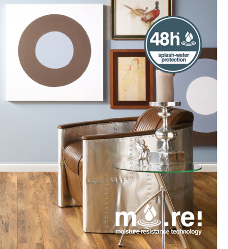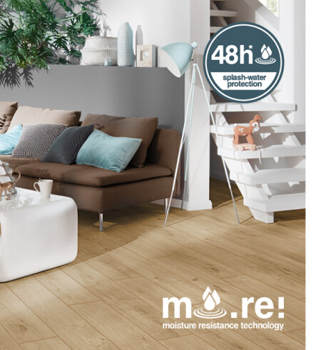MO.RE! de KRONOSPAN es un producto para suelos laminados resistente a la humedad que hace que el laminado sea aún más práctico para la vida diaria. MO.RE! hace que los suelos laminados sean aún más resistentes a la humedad. Y eso es bueno. Al fin y al cabo, hay pequeños percances diarios que pueden ocurrirle a cualquiera.